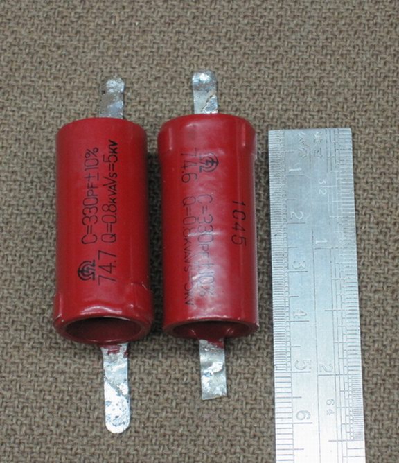 高频高压瓷电容 2.5KVA-7.5KV 高频高压瓷电容 2.5KVA-7.5KV 32.6P/1只, 50.6P/1只, 52.0P/1只, 52.7P/2只, 53.4P/3只, 54.1P/1只, 54.3P/1只, 54.4P/1只, 55.1P/1只, 55.4P/1只, 56.5P/1只, 59.6P/1只, 59.9P/3只, 60.6P/1只, 60.7P/1只, 61.1P/2只, 61.6P/1只 用MF-10型高灵敏度万用表100K档测量漏电阻值无穷大,再用高精度数字电桥测量配对精度3%.