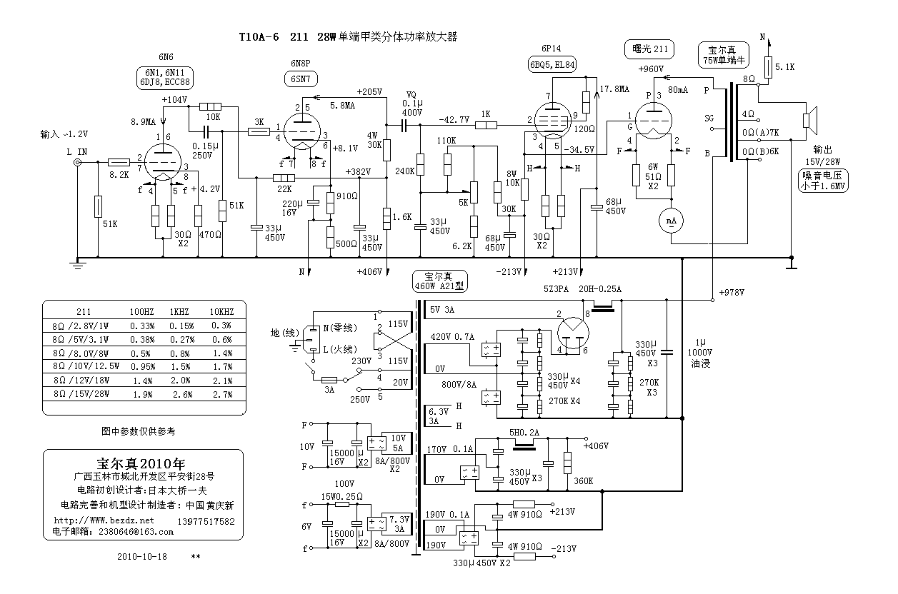 211灯丝采用直流供电. 8欧输出端 噪声电压小于1.6毫伏.
