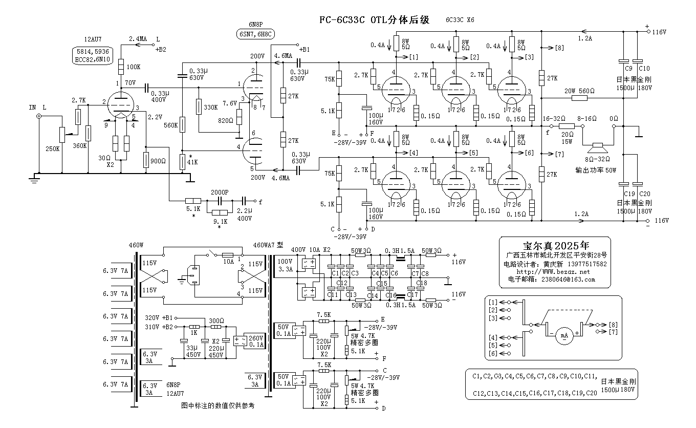 灯丝采用交流供电.8欧输出端 噪声电压小于2毫伏。